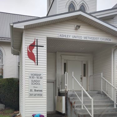 We'll round out our time in the northwest corner of the county with Ashley United Methodist Church. The current building was built after a fire destroyed their original building in 1913. The church piano was the only thing salvageable from that building.