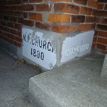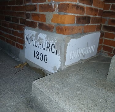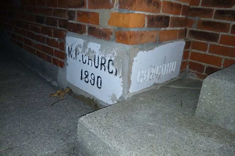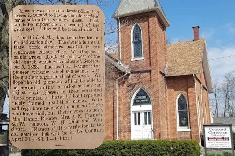 Concord Christian Fellowship is the steward of this 1890 building. It began as the Concord Methodist Protestant Church which was organized in 1843 by several of the earliest pioneers of the county. They first met in Monroe Schoolhouse near Jenkins Cemetery on CR 56, moved to a simple frame structure in 1852, and finally built this structure in 1890.