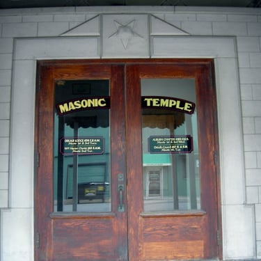 DeKalb Lodge 214 Free and Accepted Masons was chartered in 1857. They met in several locations around downtown Auburn before purchasing the Kiblinger building located where their current building is now. In 1921 they razed the Kiblinger building and a new Masonic Lodge Building was built. This building was destroyed by fire just a couple years later and was rebuilt by local builder Roland Muhn. After completing the building, Muhn joined the lodge and was the first person to be made a Master Mason in the building he had just completed.