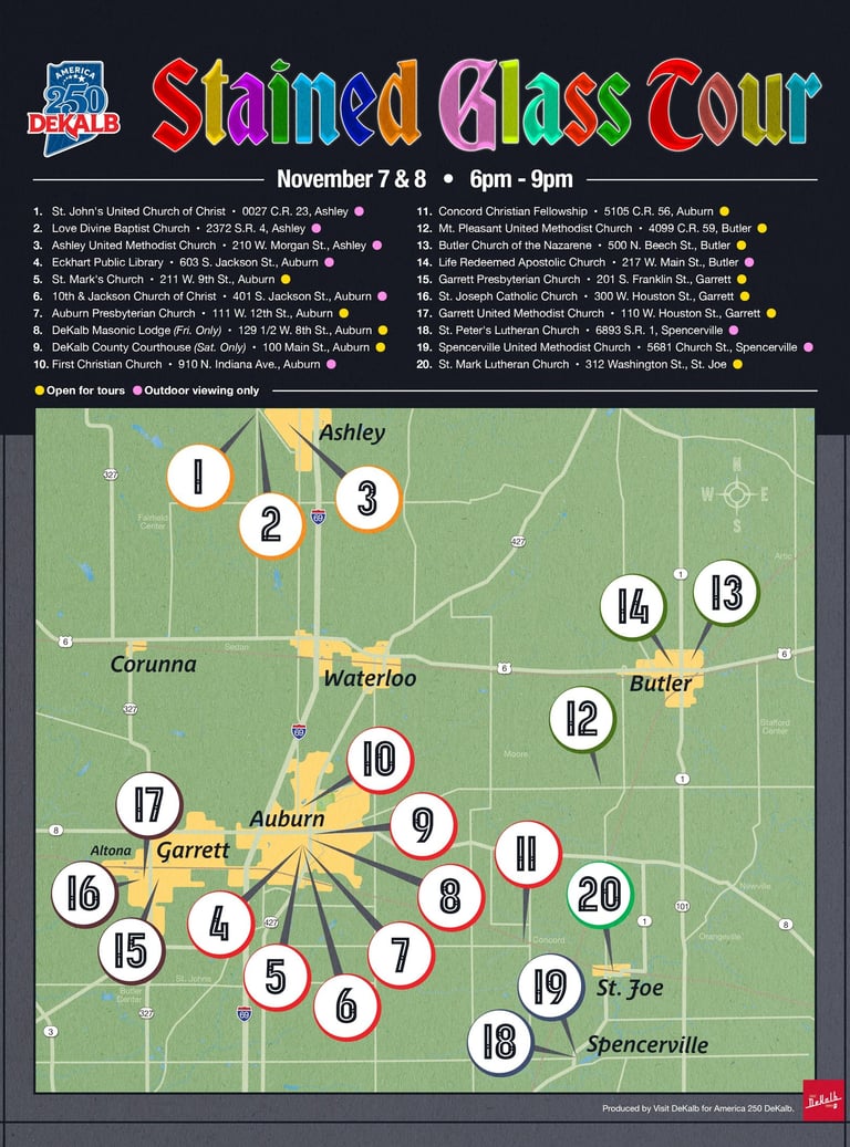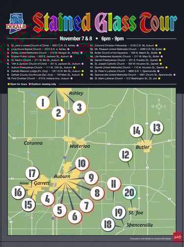 Stained Glass Windows are a real window into the past. There are many buildings in DeKalb County with beautiful stained glass windows that tell the story of their faith or their community. Twenty of those locations are a part of a Stained Glass Driving Tour on November 7th and 8th. On those evenings, between 6pm and 9pm, participating locations will illuminate their windows so we can drive by and view them. Many of those locations will also be open so that we can view the windows, and other spaces, from the inside. Follow DeKalb County Historical Society - Indiana on Facebook for highlights of the buildings and organizations involved. Their history is our history, and it's as beautiful as their windows!